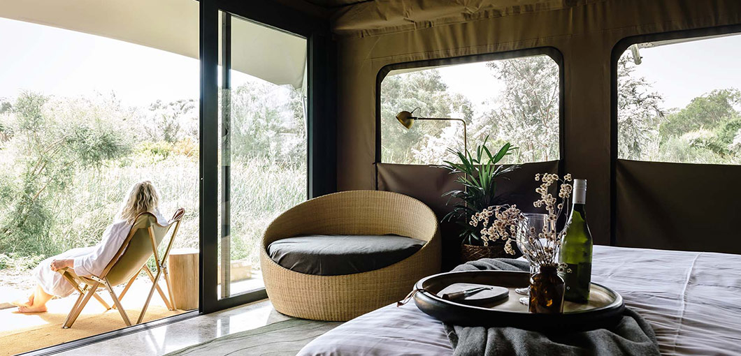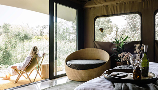 With full ensuites, each tent has floors heated by geothermal water and split systems for guests to create their own climate. Designed for pure relaxation, Peninsula Hot Springs’ glamping accommodation is nestled in the natural surrounds of the hot springs, with private decks, king beds with luxury linen, walk-in robes, and bespoke elements inspired by the environment.