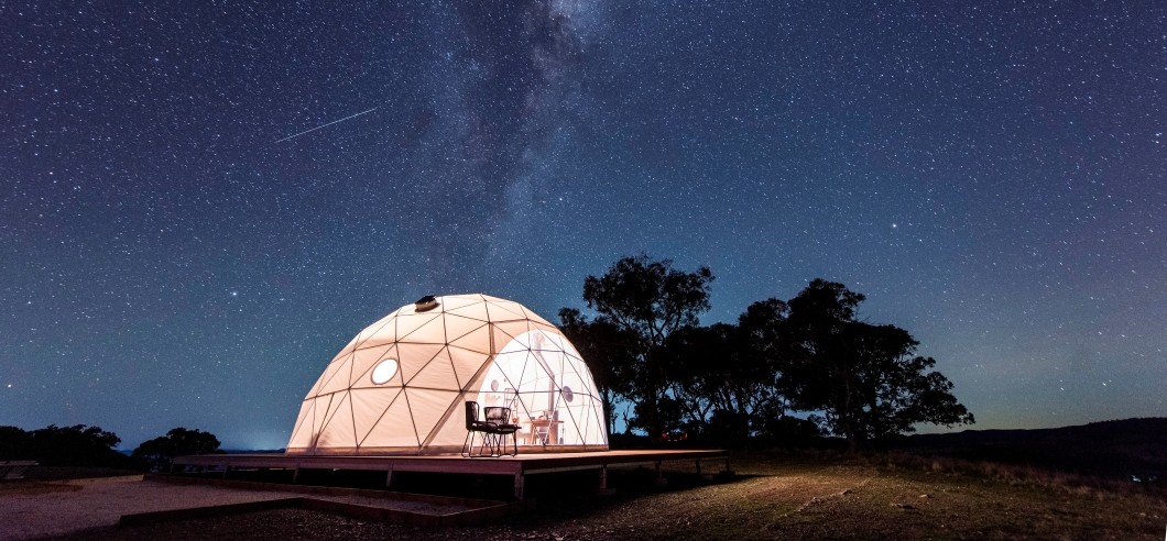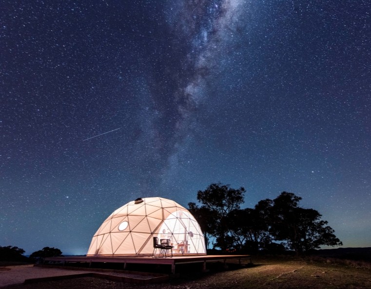 Set amongst a stunning backdrop of natural Australian bushland, you’ll stay in a striking geodesic dome known as “Amaroo” (meaning ‘beautiful place’). It provides a truly deluxe escape, offering all the modern comfort that you would expect in a 5-star cottage or cabin – a super comfy bed, cosy linen, an ensuite, a kitchenette, firepit and indoor wood fire heater. Plus, there’s a large bay window allowing you to view the ocean of stars from your bed.