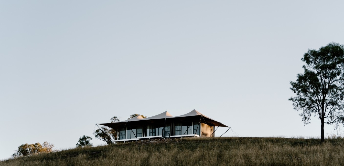 Budgalong Lodge offers a unique 100% off-grid escape in the Australian countryside, blending luxury with nature. Each safari-style glamping accommodation boasts Australian craftsmanship, featuring canvas sourced from Africa for durability, and interiors sourced locally for a touch of homegrown charm. The property can accommodate up to 8 guests at a time in two private and secluded tents, each featuring two ensuite bedrooms, a spacious living area, and eco-friendly amenities. Take a walk to a scenic lookout, toast marshmallows around the firepit, or cook up a storm with locally sourced produce.