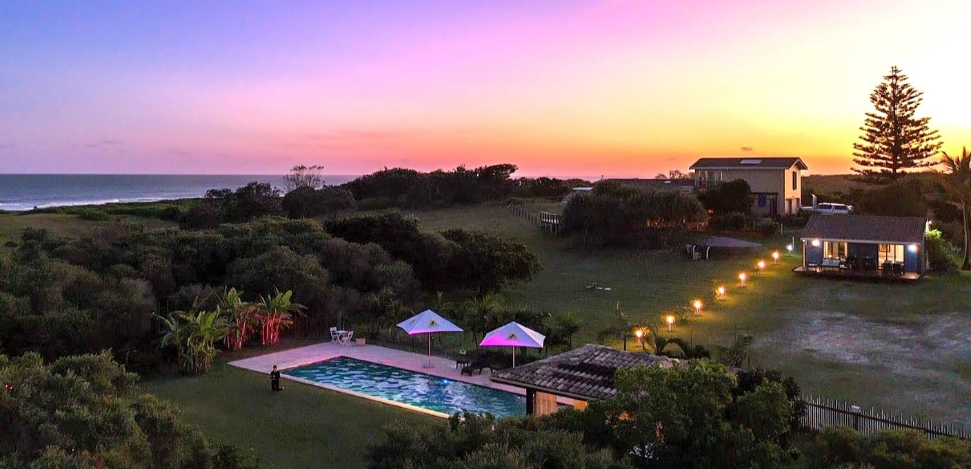 Accommodation options include beach bungalows, BYO camping or luxury glamping tents with access to 60 acres of private land, a resort-style magnesium pool, and abundant wildlife.